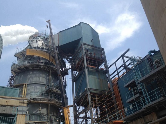2015年5月1日11時16分,在業主、監理、國能中電太倉項目部、施工單位以及相鄰國華太倉電廠業主的共同見證下,6#吸收塔增高施工當天成功頂升圍板,這預示著協鑫太倉超低排放項目的建設進度更進一步。