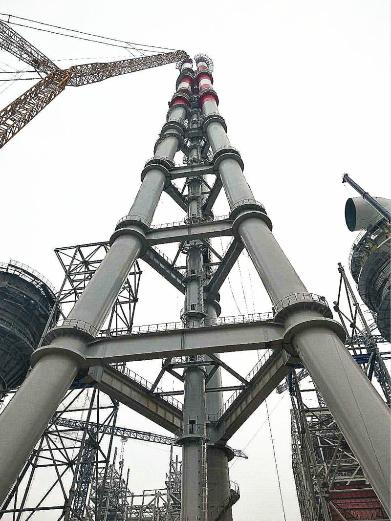 項目配套的三管自立式鋼煙囪,是國能中電引進日本三菱多管自立煙囪技術(shù),并整合了日本鈦板貼襯技術(shù)建設而成,煙囪內(nèi)徑4.5米,高度180米,分7層,總重2108t。三管自立式鋼煙囪結(jié)構(gòu)合理、造型美觀。三根鋼管煙囪按正三角形布置,通過三角形鋼梁進行剛性連接,形成集束式穩(wěn)定結(jié)構(gòu),每個煙囪由多個直段拼接成流線型曲線。通過整體空間結(jié)構(gòu)來共同抵抗地震荷載、風荷載及其它荷載,整個煙囪結(jié)構(gòu)形體規(guī)則,各向受力均勻,造型簡潔、美觀,全面融入了現(xiàn)代氣息和建筑美學的設計理念。自2018年8月12日開始施工建設,采用SCC9000/900噸履帶式起重機分七段進行吊裝,在參建各方的共同努力下,歷時135天,于2018年12月25日順利吊裝到頂。